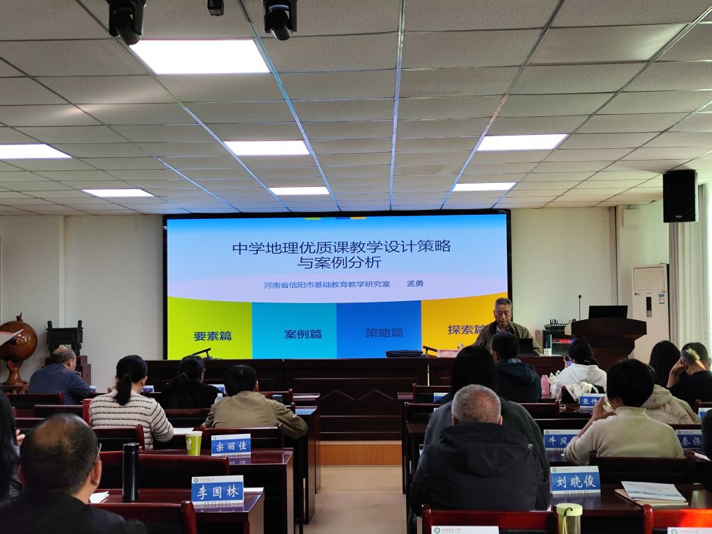 11月30日下午,信阳市基础教育教学教研室地理教研员孟勇老师于理科楼南楼410会议室作了题为“中学地理优质课教学设计策略与案例分析”的专题讲座。孟老师从中考趋势与职称评审改革切入,系统阐述了优质课应如何从理念、操作与策略层面综合设计,并以《自然环境对地方文化的影响》为例,从课标解读、目标设定到教学反思等九个维度解析了教学设计的关键要素。他强调,优质地理教学须以核心素养为导向,融入真实情境、贯通实践与创新,为参会师生提供了系统的设计框架与行动方向。