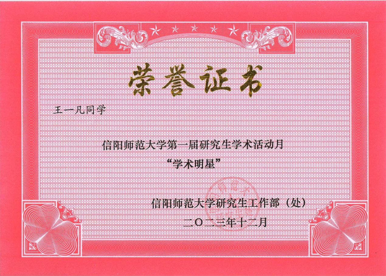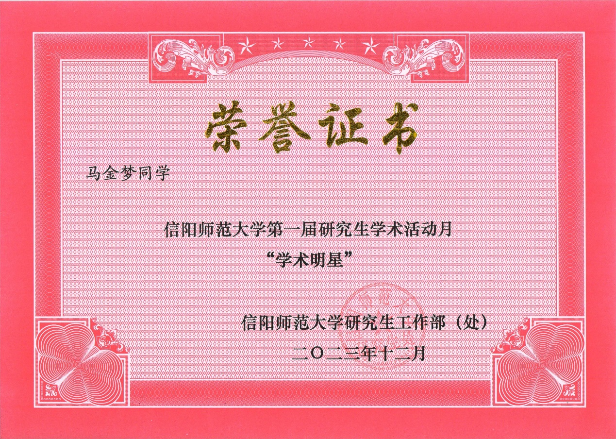 皇冠APP体育研究生“学术明星”面向全校研究生评选,是学术活动月的重要活动之一,从全校近2000名研究生中选出10名,历来受到学校师生的广泛关注,竞争十分激烈。此次王一凡和马金梦再次荣获“学术明星”荣誉,不仅充分展现了皇冠APP体育学子积极向上的精神风貌,也是对学院研究生教育的肯定和激励。今后,学院将认真落实立德树人根本任务,营造良好的学术氛围,发挥榜样引领作用,推动学院研究生教育工作更上一层楼,为高水平师范大学建设作出新的更大贡献。