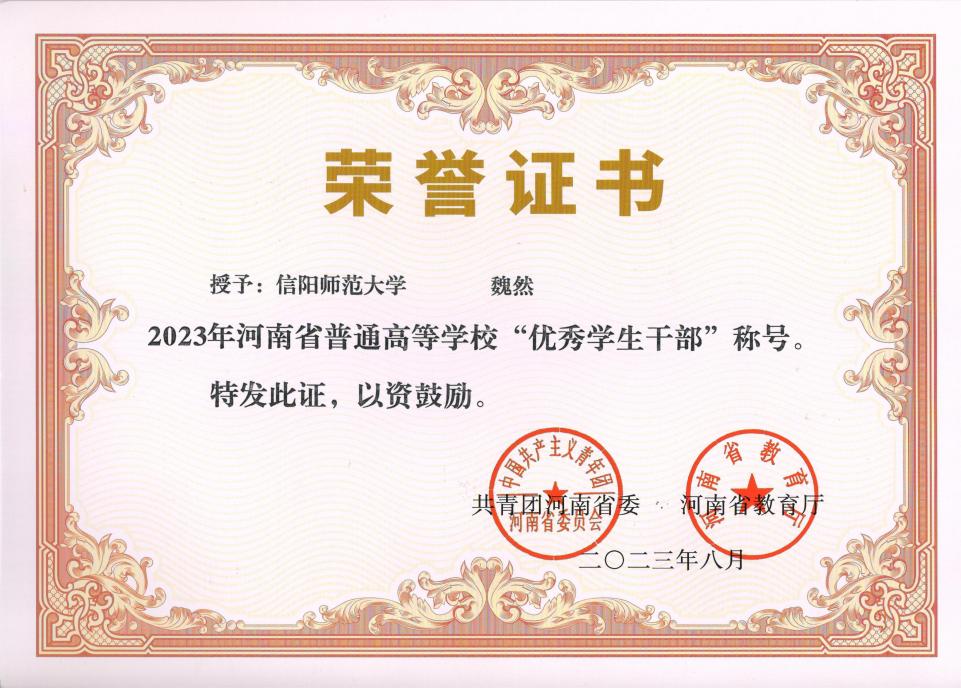 近日,共青团河南省委、河南省教育厅下发了《关于发布2023年河南省普通高等学校三好学生、优秀学生干部和先进班集体名单的通知》(豫青联字〔2023〕28号),皇冠APP体育研究生学生干部魏然荣获河南省“优秀学生干部”荣誉称号。
