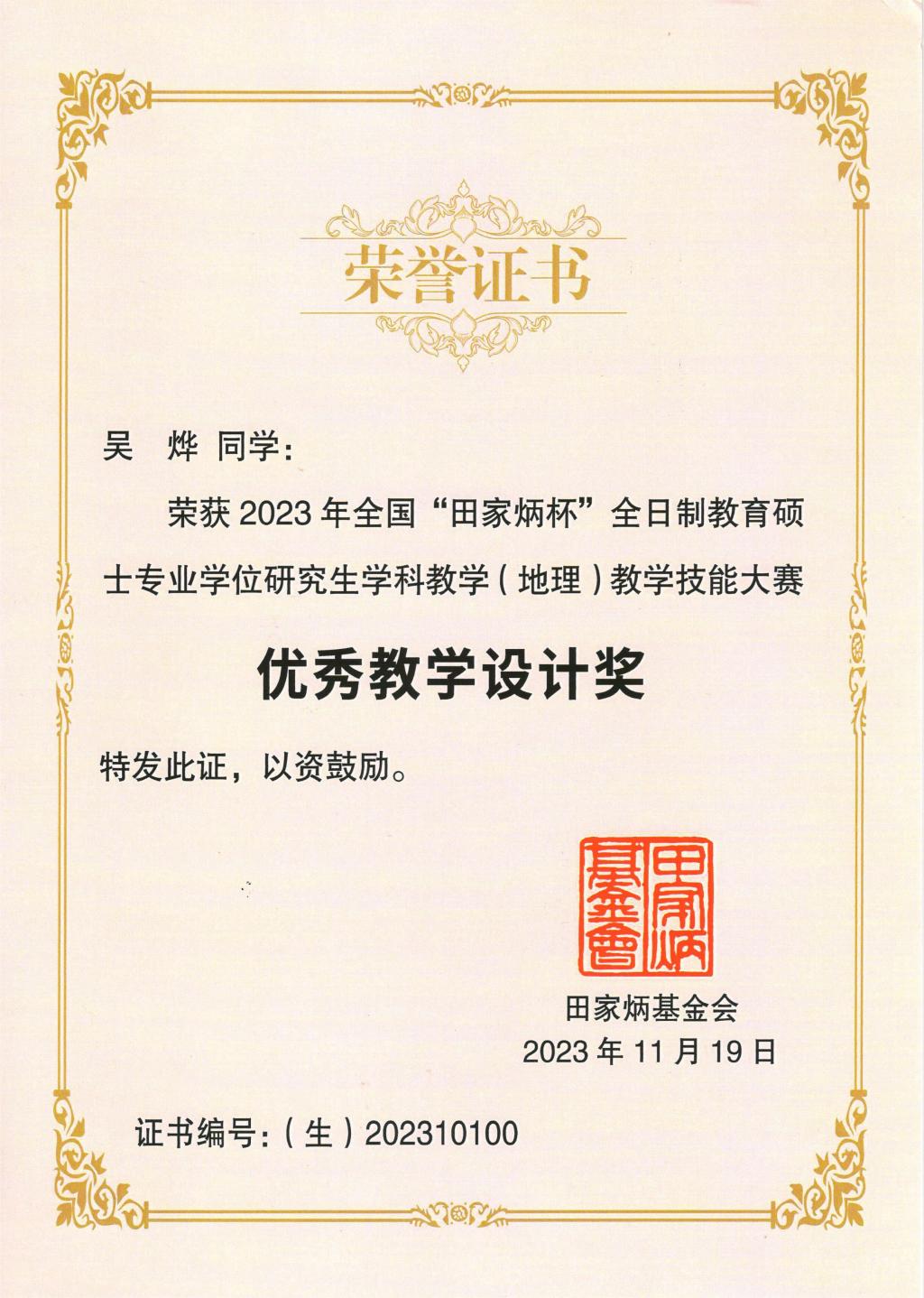 11月17—19日,2023年全国“田家炳杯”全日制教育硕士专业学位研究生学科教学(地理)教学技能大赛决赛在南京师范大学举行并圆满落幕。皇冠APP体育2022级学科教学(地理)专业研究生吴烨参加本次大赛并获得优秀教学设计奖。