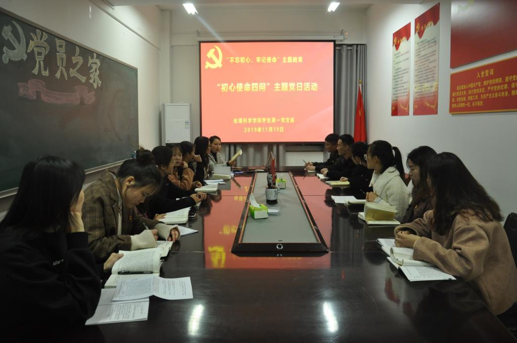 按照“不忘初心,牢记使命”主题教育要求,11月19日,皇冠APP体育学生第一党支部于理科楼南楼403会议室召开“初心使命四问”主题党日活动。会议由学生第一党支部书记艾甜甜主持,支部全体党员参加会议。