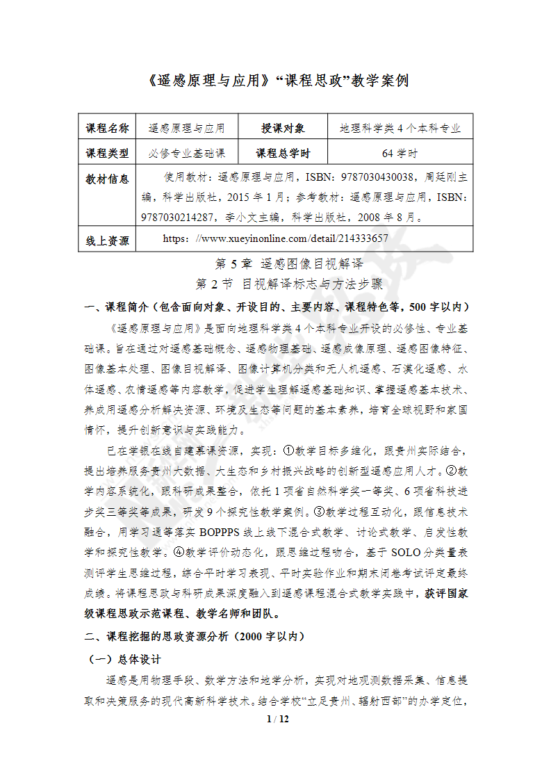 《遥感原理与应用》课程思政教学案例